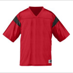 100% polyester tricot mesh * 100% polyester dazzle fabric yoke and sleeves * 1x1 rib-knit modified V-neck collar * Front and back yoke large enough for embellishment * Set-in sleeves with contrast-color insert * Outside locker label is on wearer's left side near bottom hem * Not meant to be worn with pads